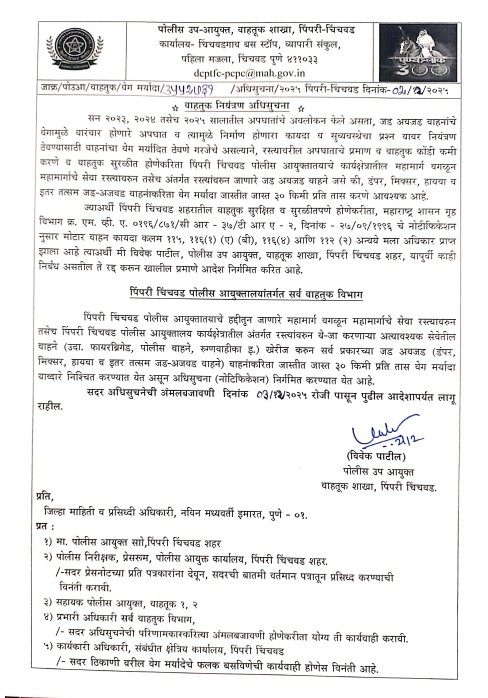 “त्यानुसार पिंपरी चिंचवड पोलीस आयुक्ताल अंतर्गत सर्व वाहतूक विभागांमध्ये पिंपरी-चिंचवड पोलीस आयुक्तांच्या हद्दीतून जाणारे महामार्ग वगळून महामार्गाचे सेवा रस्त्यावरून तसेच पिंपरी-चिंचवड पोलीस आयुक्तालय कार्यक्षेत्रातील अंतर्गत रस्त्यांवरून ये-जा करणाऱ्या अत्यावश्यक सेवेतील वाहने उदा. फायर ब्रिगेड, पोलीस वाहन, रुग्णवाहिका इ. खेरीज करून सर्व प्रकारच्या जड-अवजड (डंपर, मिक्सर, हायवा व इतर तत्सम जड अवजड) वाहनांकरिता जास्तीत जास्त 30 किलोमीटर प्रति तास वेग मर्यादा निश्चित करण्यात आली असून याबाबतची अधिसूचना अर्थात नोटिफिकेशन निर्गमित करण्यात आले आहे. या अधिसूचनेची अंमलबजावणी दिनांक 3 डिसेंबर पासून पुढील आदेशापर्यंत लागू राहील, असे आदेश पिंपरी-चिंचवड वाहतूक शाखेचे पोलीस उपायुक्त विवेक पाटील यांनी जारी केले आहे.”
