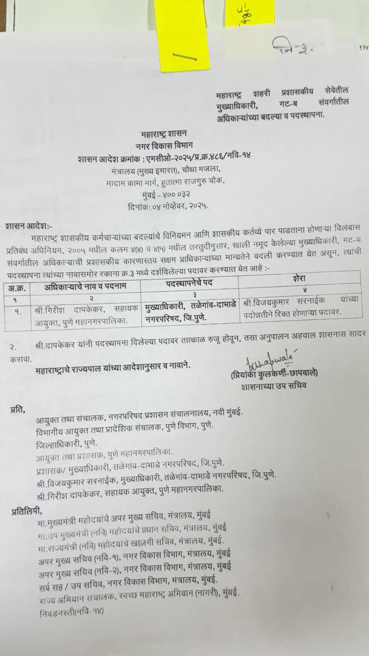 महाराष्ट्र शासनाच्या नगरविकास विभागाने याबाबतचे शासन आदेश जारी केले आहेत. शासनाच्या उप सचिव प्रियंका कुलकर्णी छापवाले यांच्या सहीचे पत्रक समोर आले आहे. त्यानुसार तळेगाव दाभाडे नगरपरिषदेचे विद्यमान सीईओ विजयकुमार सरनाईक यांची पदोन्नती होऊन बदली झाली आहे. त्यामुळे त्यांच्या जागी पुणे महानगरपालिकेचे सहाय्यक आयुक्त गिरीश दापकेकर यांची नियुक्ती करण्यात आली आहे.
