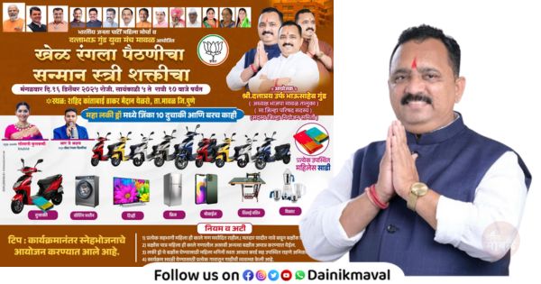 Dainik Maval News : दत्ताभाऊ गुंड युवा मंच मावळ आणि भारतीय जनता पार्टी महिला मोर्चा आयोजित खेळ रंगला पैठणीचा सन्मान स्त्री शक्तीचा हा खास कार्यक्रम मंगळवार, दिनांक 16 डिसेंबर 2025 रोजी सायंकाळी पाच ते रात्री दहा वाजेपर्यंत आयोजित करण्यात आला आहे. येळसे ( ता. मावळ ) येथील शहीद कांताबाई ठाकूर मैदान या ठिकाणी हा कार्यक्रम संपन्न होणार आहे.
