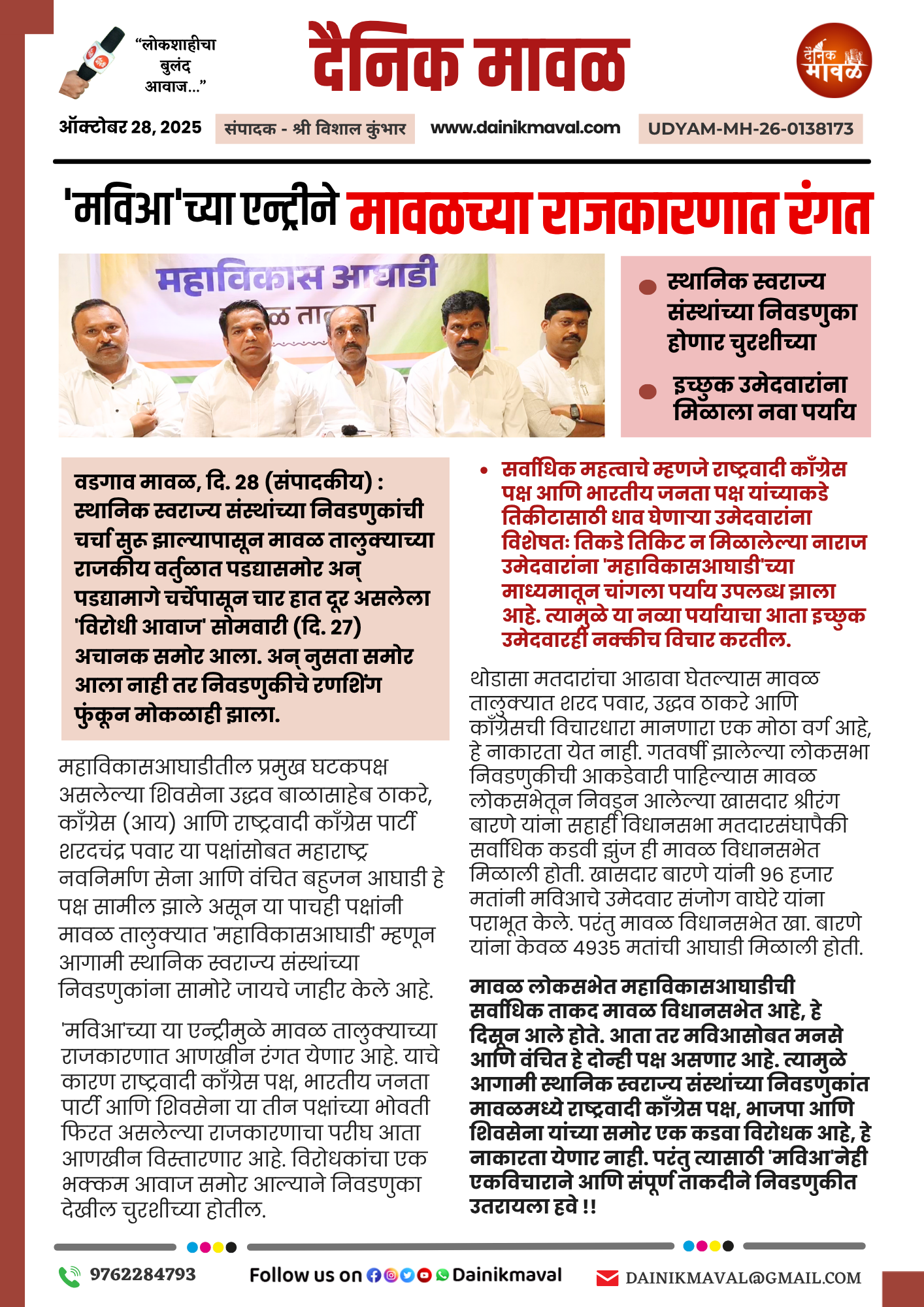 ‘मविआ’च्या या एन्ट्रीमुळे मावळ तालुक्याच्या राजकारणात आणखीन रंगत येणार आहे. याचे कारण राष्ट्रवादी काँग्रेस पक्ष, भारतीय जनता पार्टी आणि शिवसेना या तीन पक्षांच्या भोवती फिरत असलेल्या राजकारणाचा परीघ आता आणखीन विस्तारणार आहे. विरोधकांचा एक भक्कम आवाज समोर आल्याने निवडणुका देखील चुरशीच्या होतील.