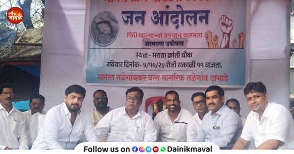 Dainik Maval News : तळेगाव ते चाकण महामार्गावरील प्रचंड खड्ड्यांमुळे नागरिक त्रस्त झाले असून अखेर तळेगावकर नागरिकांनी पीडब्ल्यूडी विभागाच्या गलथान कारभाराविरोधात मराठा क्रांती चौकात आमरण उपोषणास सुरुवात केली. अनेक वर्षांपासून या महामार्गावर मोठमोठे खड्डे पडले असून, या खड्ड्यांमुळे अनेक अपघात घडले आहेत आणि निरपराध नागरिकांचे प्राण गेले आहेत. वारंवार तक्रारी करूनही पीडब्ल्यूडी विभागाकडून दुरुस्तीचे कोणतेही ठोस पाऊल उचलले गेले नाही. या निष्क्रियतेविरोधात अखेर नागरिक रस्त्यावर उतरले आहेत.