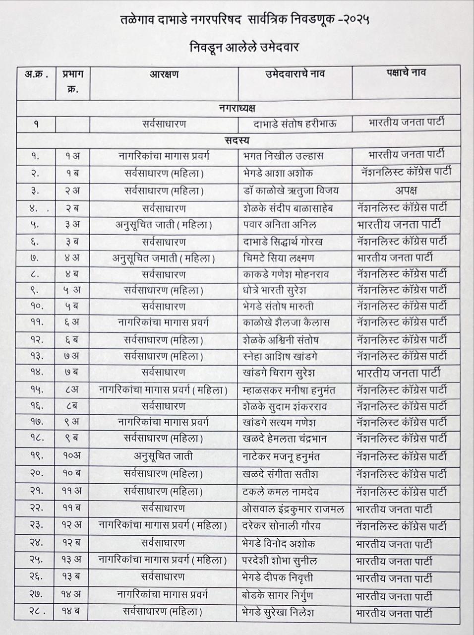 Dainik Maval News : तळेगाव दाभाडे नगरपरिषद सार्वत्रिक निवडणूक 2025 चा निकाल दिनांक 21 डिसेंबर रोजी जाहीर झाला अन् मावळ तालुक्यातील या प्रमुख स्थानिक स्वराज्य संस्थेवर नगराध्यक्षपदी भाजपा, तर सर्वाधिक नगरसेवक निवडून आल्याने राष्ट्रवादी काँग्रेस पार्टीचा झेंडा फडकणार, हे जवळपास निश्चित झाले. आजी-माजी आमदार असलेल्या या शहराचे राजकारण संपूर्ण राज्यात चर्चेचा विषय राहिले. परंतु निकाल जाहीर झाल्यानंतर राष्ट्रवादी काँग्रेस पार्टीचे विद्यमान आमदार सुनील शेळके यांचे येथील वर्चस्व जवळपास सिद्ध झाले.