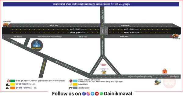 अ) प्रवेश करण्याकरिता – कामशेत शहरात प्रवेश करण्याकरिता पवना चौक ते छत्रपती शिवाजी महाराज चौक या दरम्यान सर्व वाहने प्रवेश करतील दोन्ही (बाहेर पडणेकरिता प्रवेश बंद राहील)