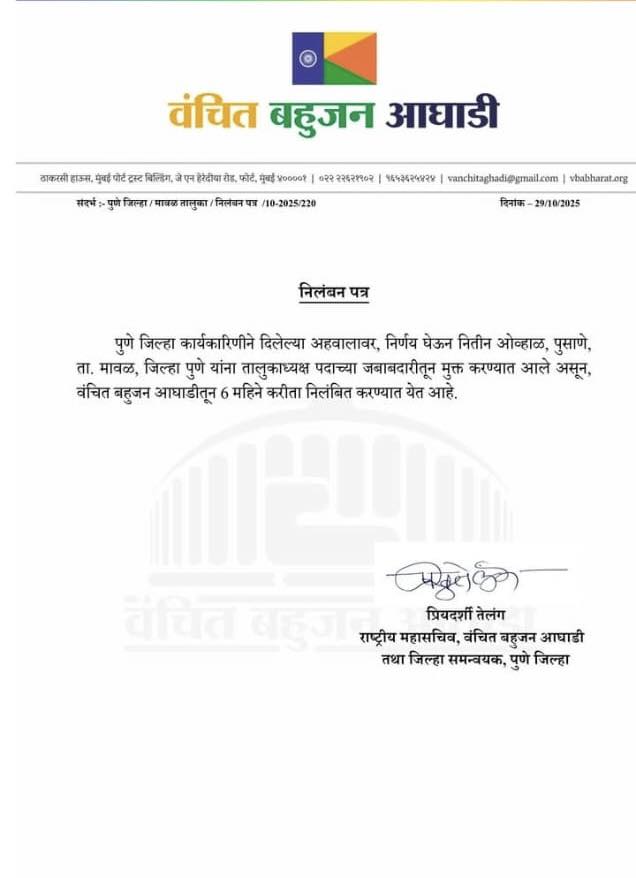 पक्षाचे पुणे जिल्हा समन्वयक तथा वंचित बहुजन आघाडीच्या राष्ट्रीय महासचिव प्रियदर्शी तेलंग यांनी याबाबतचे पत्र जाहीर केले आहे. बुधवारी हे पत्र समोर आले. त्यानुसार, पुणे जिल्हा कार्यकारिणीने दिलेल्या अहवालानुसार निर्णय घेऊन नितीन ओव्हाळ यांना तालुकाध्यक्ष पदाच्या जबाबदारीतून मुक्त करण्यात आले असून वंचित बहुजन आघाडी पक्षातून सहा महिने करिता निलंबित करण्यात येत आहे, असे म्हटले आहे.
